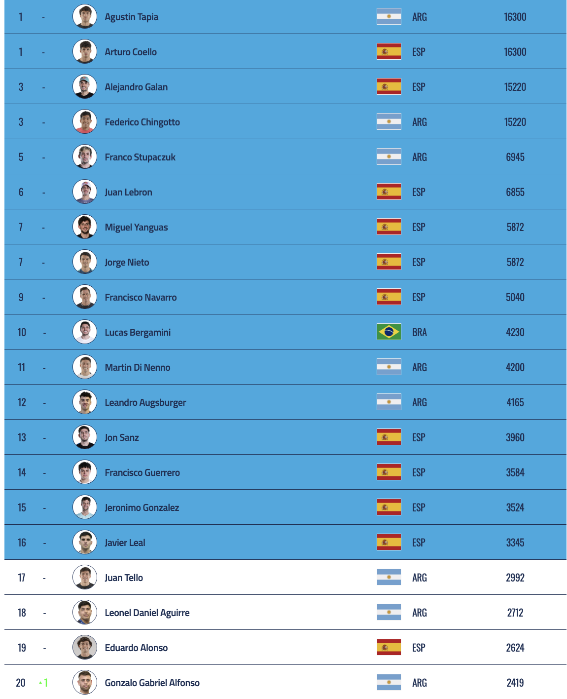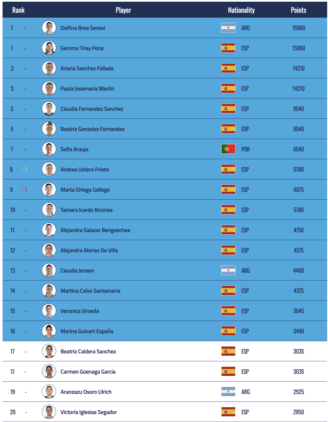On the women’s side, 455 points separate Marina Guinart, currently just inside the top 16, from Beatriz Caldera and Carmen Goenaga, who share 17th place.